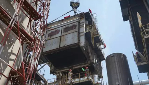 空氣預(yù)熱器逐步分離,舉高、旋轉(zhuǎn)、落地,在650噸履帶式吊車站位地面完成了585立方米的“換填”工作,施工人員克服天氣炎熱等諸多困難完美收官!